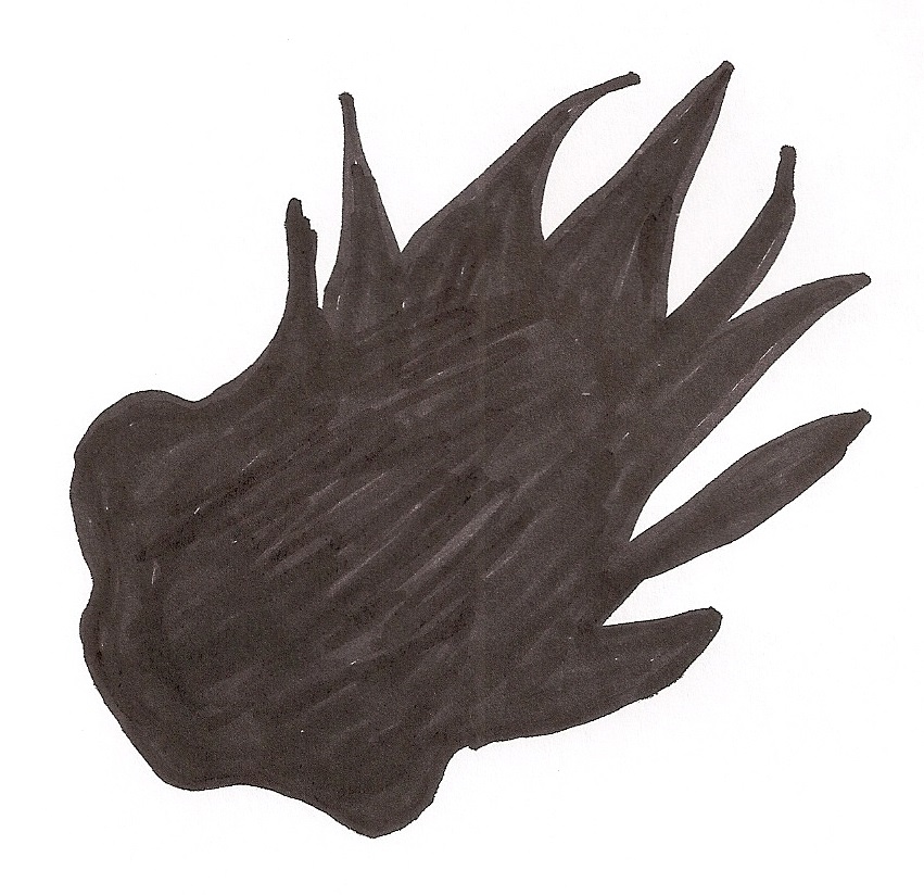 Then my lucid dream Covert Light Ops Mission to certain countries in the Middle East happened in the early morning hours of 12-31-13–New Year’s Eve. Three days later–January 3, 2014– I woke up in the morning as usual, and while making my bed spotted some strange black thing laying dead and lifeless on my pillow, mere inches away from where my head had been moments before. It was about 5–6 inches tall by about 5 inches wide and was flat like a leaf. The bottom edge of it was semi-rounded and the sides and top had long, jagged, finger-like extensions. It was a very dark brown-black color and was definitely dead. I scribbled out the drawing above of it to give you a basic idea of what I saw.