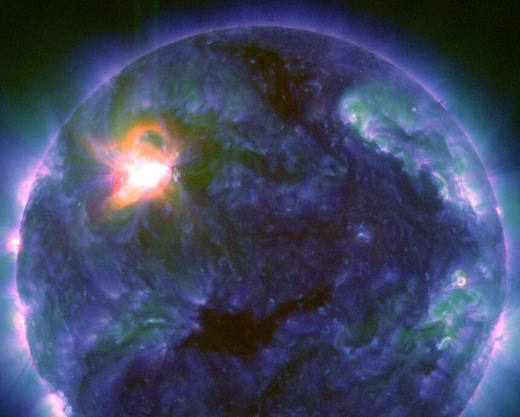 You might think all these flares would have hurled at least one CME toward Earth. In fact, the number is zero. SOHO coronagraphs have not detected any CMEs emerging from the blast zone. Sometimes this happens. Flares can occur without CMEs, and CMEs can occur without flares.