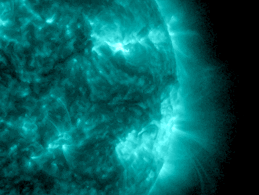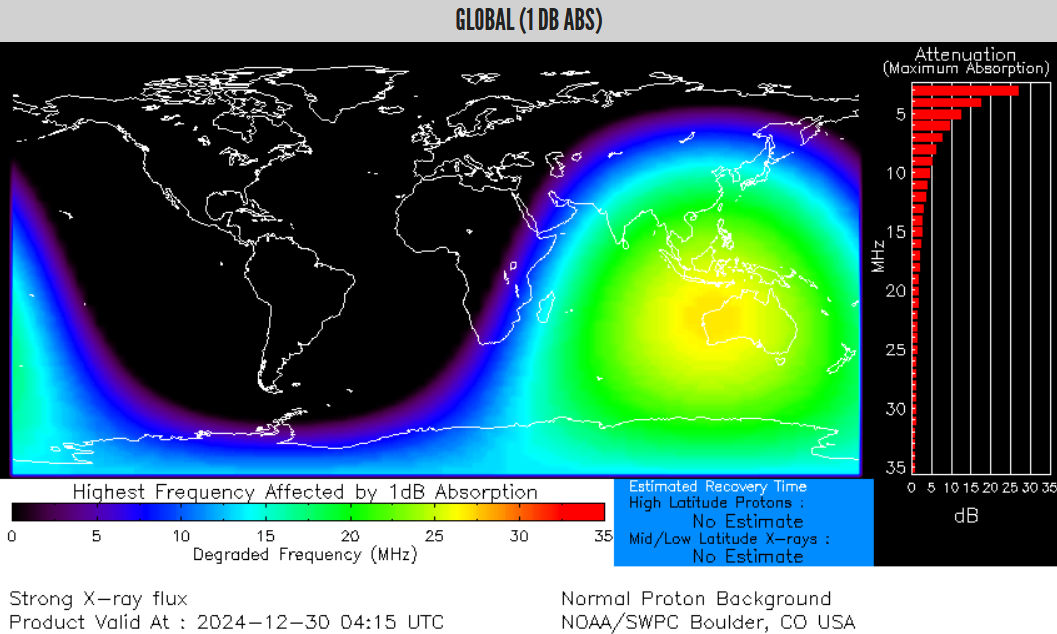 This is actually a double X-flare. Both explosions pictured above crossed the X1 threshold. Extreme ultraviolet radiation from the flares ionized the top of Earth’s atmosphere, causing a shortwave radio blackout approximately centered on Australia. Ham radio operators in the area may have lost signal below 20 MHz for as much as an hour around 0430 UTC.