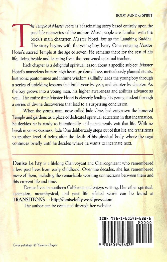 The Temple of Master Hotei: A Unique Past Life Memory (2008, revised 2013) is available in paperback (204 pages) at all brick-and-mortar bookstores or can be ordered from them. It’s available in paperback and Ebook PDF format at the publisher, Booklocker.com. It’s available from all online booksellers in both paperback and Ebook formats for Kindle, Nook, iPad, iPod, iPhone and Kobo.