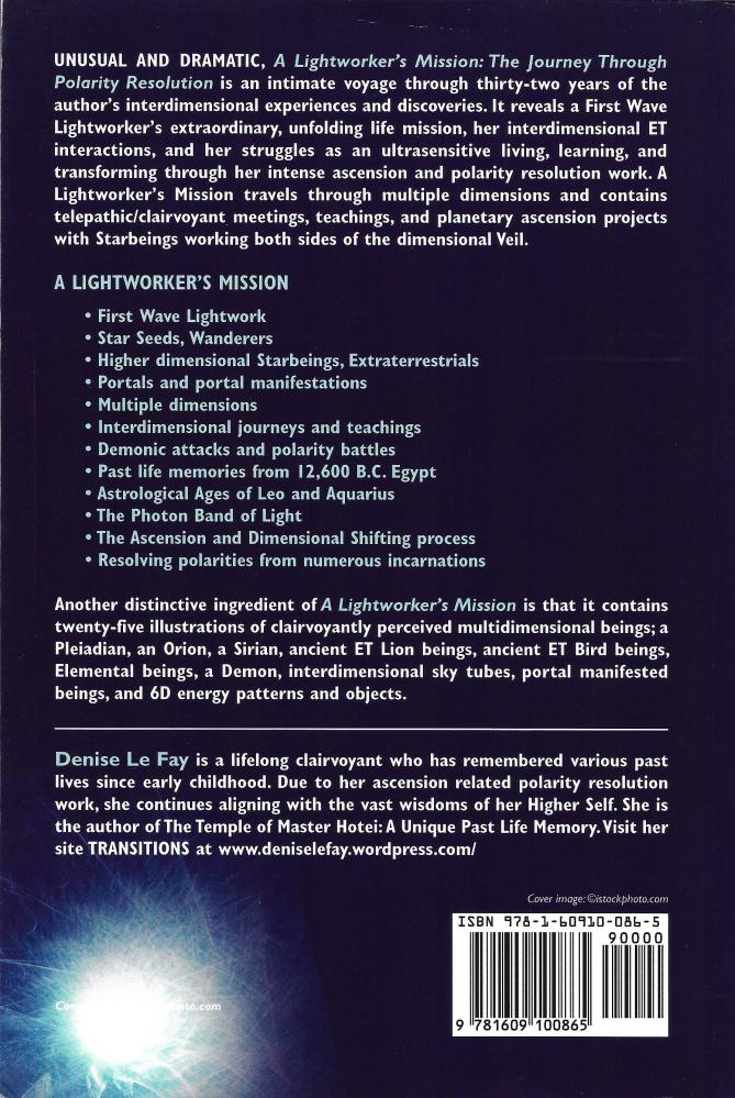 A Lightworker’s Mission: The Journey Through Polarity Resolution (January 2010) covers over thirty-two years of the authors spiritual and transformational experiences as a First Wave Starseed/Wanderer Lightworker.